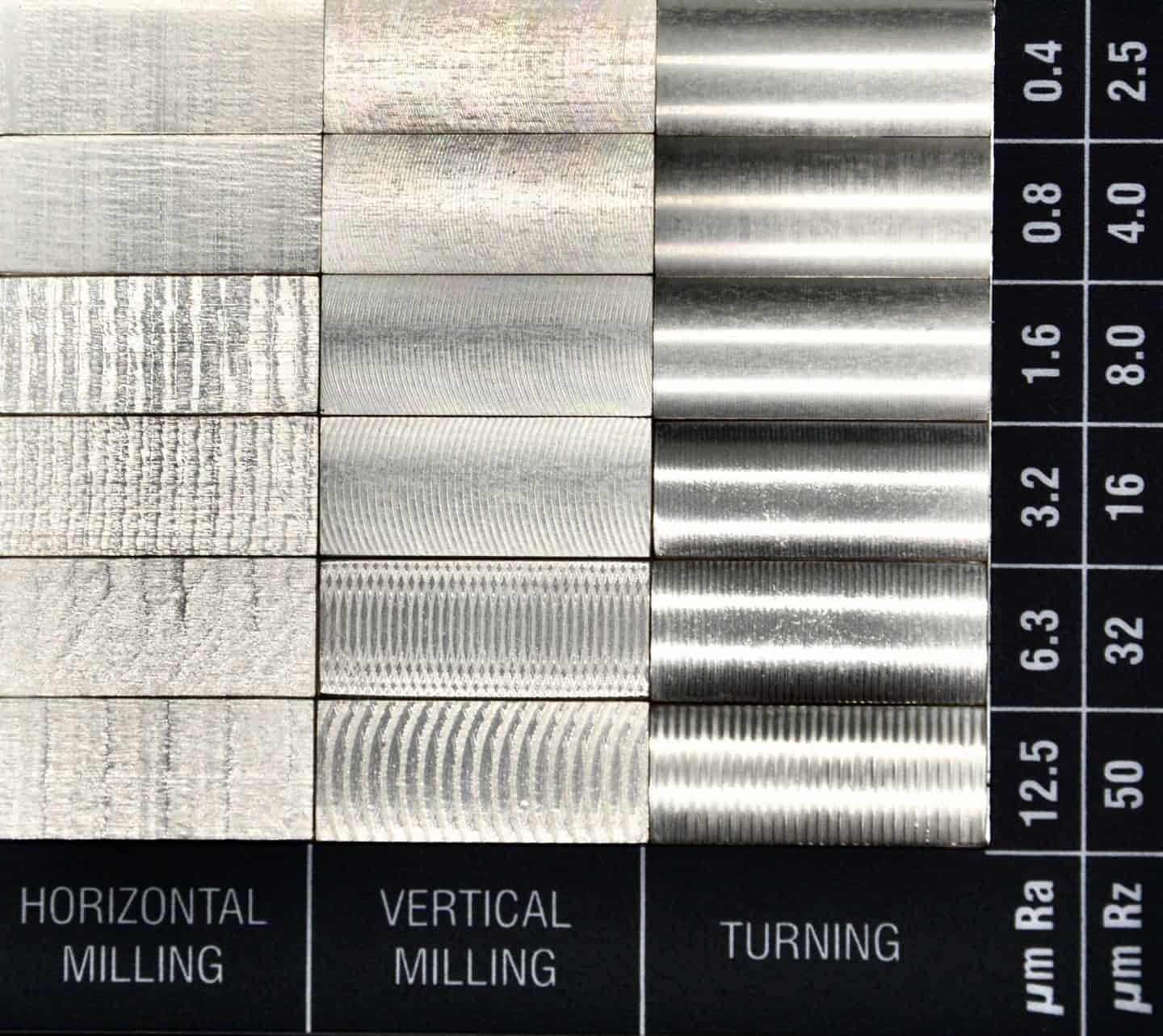 Usually, there are only slightly visible cut marks with this option. This Ra rating is recommended for tight fits and stressed parts, and is sufficient for slow-moving and light load-bearing surfaces. However, it is not suitable for fast rotating parts and parts subject to intense vibration. This surface roughness is produced using high speeds, fine feeds, and light cuts under controlled conditions.