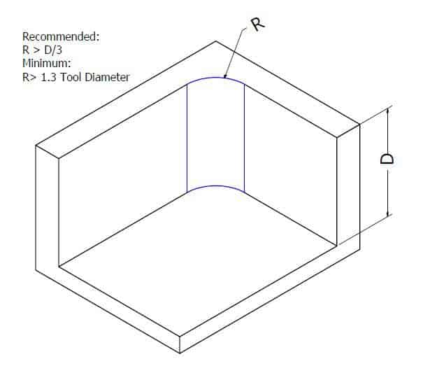 Designing internal edges can be stressful on the machining tool considering its shape. Since most cutting tools are cylindrical and cannot machine sharp internal edges, it is important to add radii to internal edges in your design. To avoid wear and tear of the tool, it is necessary to design internal edges that would not stress the tool more than necessary. In order to achieve this, a good rule of thumb is to add a radius of 130% of the milling tool radius. If your milling tool has a radius of 5 mm, it is recommended that you add a radius of 6.5 mm to all your internal angles. This additional radius would reduce stress on the tool and increase cutting speed.